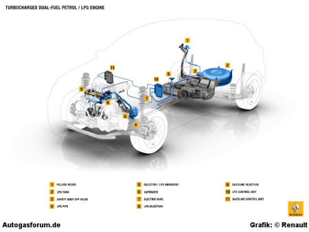„Eine große Herausforderung war es, den Ladedruck und die Motorsteuerung für eine maximale Effizienz an den Flüssiggasbetrieb anzupassen“, so die Renault Motorenentwickler. Die LPG-Komponenten sollen direkt im Werk eingebaut werden.